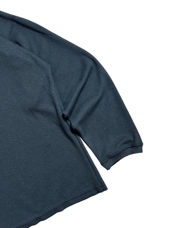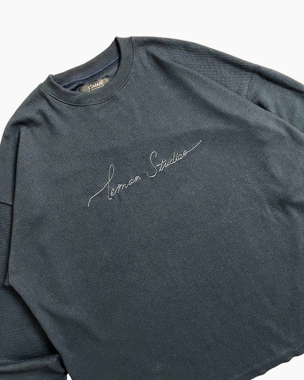 Buzo cuello redondo bordado en su parte delantera, con pequeños desgastes en sus puños.